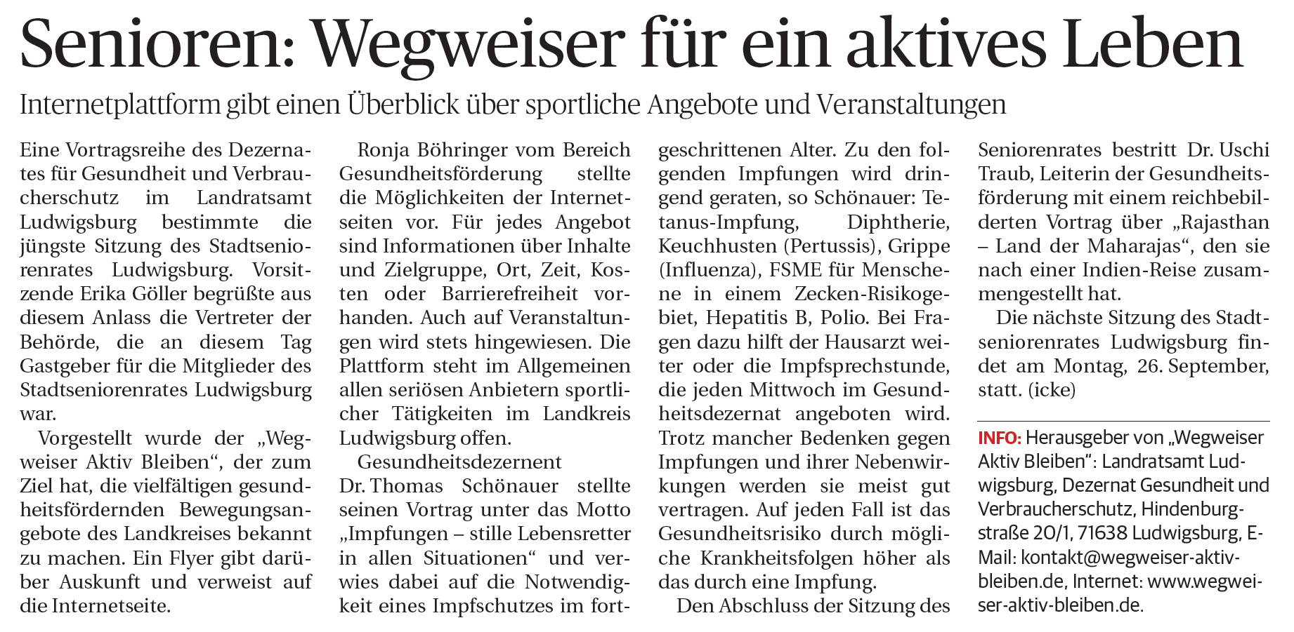 Die Ludwigsburger Kreiszeitung berichtet über die Sitzung des Stadtseniorenrats bei dem der Wegweiser Aktiv Bleiben und seine Funktionen vorgestellt wurden. Lesen Sie den Artikel hier.