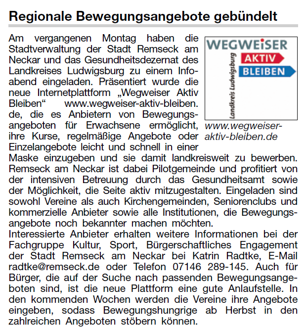 Amtsblatt Remseck "Regionale Bewegungsangebote bündeln"