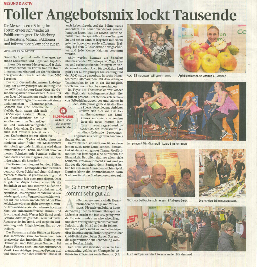 Das Team des Wegweiser Aktiv Bleiben stellt die Plattform am 03. + 04. Februar 2018 auf der Messe gesund und aktiv vor. Am Stand gibt es auch etwas zu gewinnen. So sollen die Bürgerinnen und Bürger des Landkreises die Seite besser kennelernen. Den zugehörigen Artikel aus der Ludwigsburger Kreiszeitung finden Sie hier.